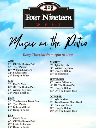 Join us on the patio every Thursday night at 7pm for live music! In the event of rain or bad weather, music will be moved inside to the bar area.